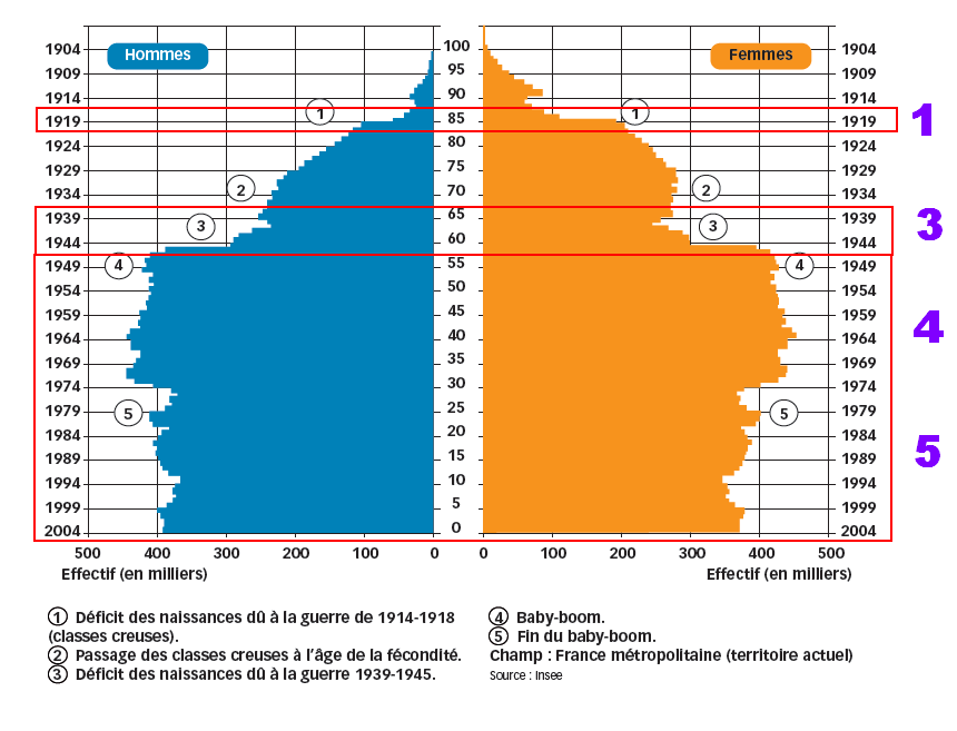 Ci-dessus les déficits de naissances causés par les deux guerres mondiales (1 et 3). On voit bien que les hommes tués au combats manquent à l’appel de la démographie. Puis les guerres cessent et les naissances reprennent comblant le déficit masculin afin de rétablir tout naturellement l’équilibre entre les hommes (48% environ) et les femmes (52%).